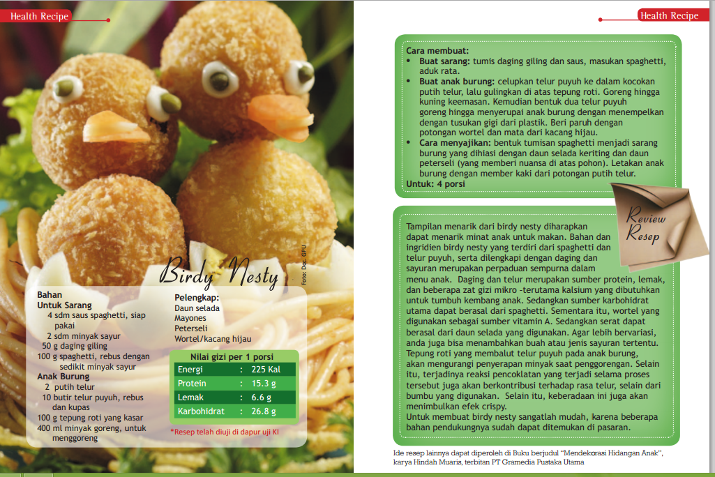 3. Cara menyajikan: bentuk tumisan spaghetti menjadi sarang burung yang dihiasi dengan daun selada keriting dan daun peterseli (yang memberi nuansa di atas pohon). Letakan anak burung dengan member kaki dari potongan putih telur.